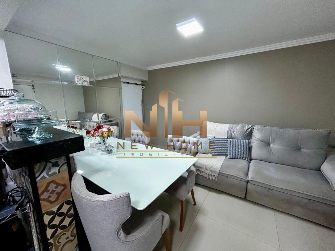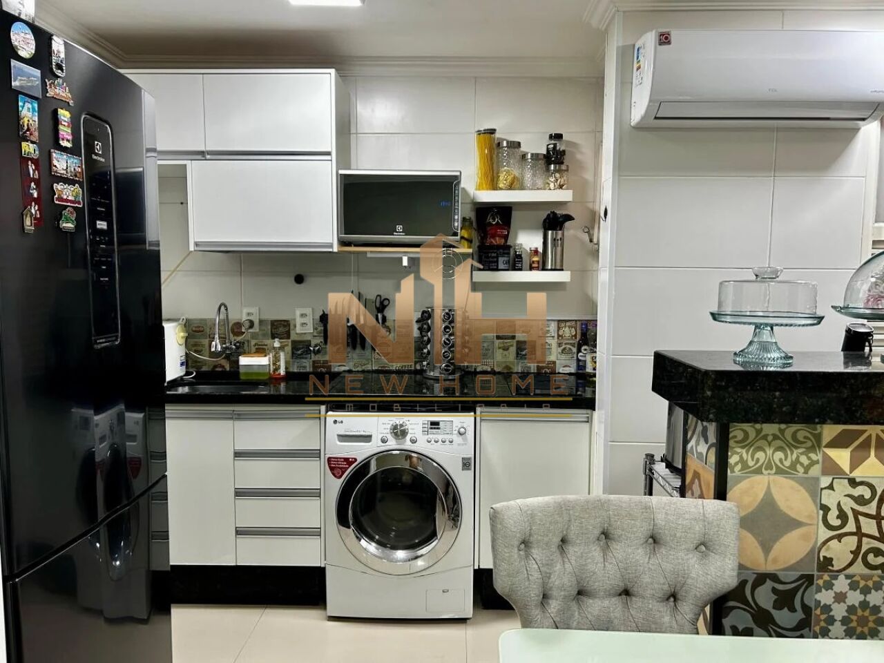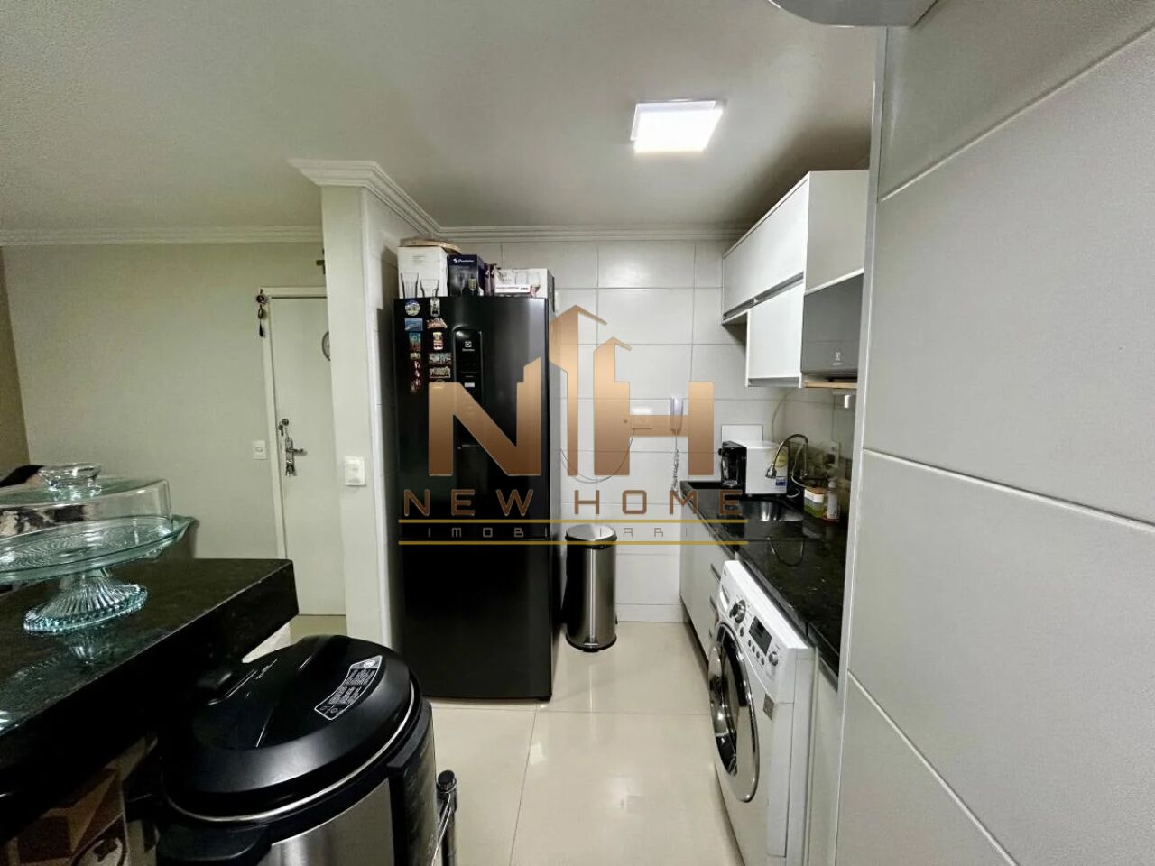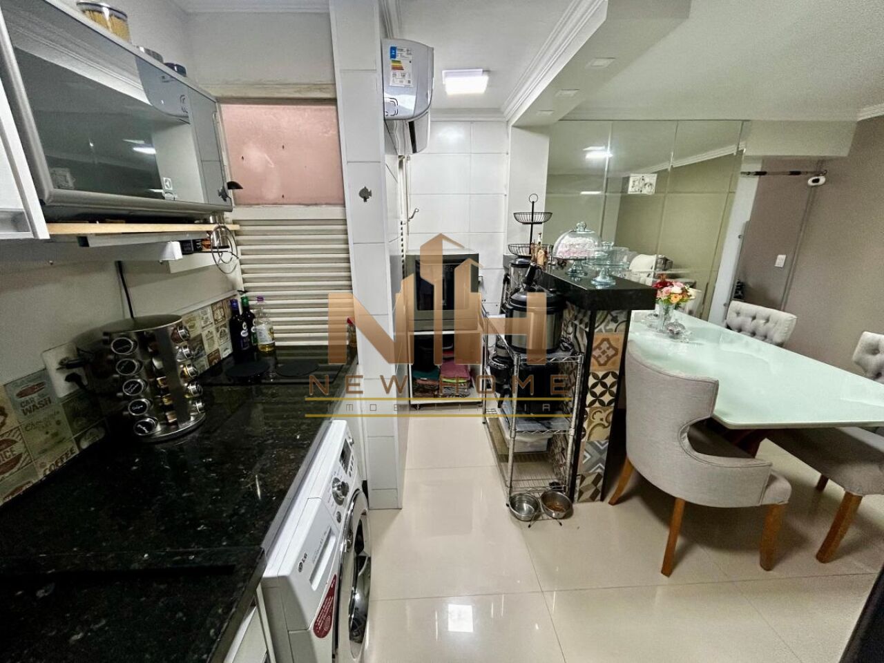 O apartamento foi remodelado para comportar uma cozinha americana com balcão de mármore e revestimento premium, proporcionando integração entre os ambientes e criando uma planta mais ampla e confortável.