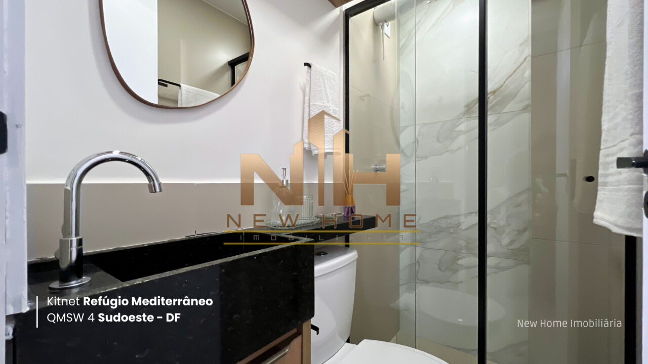 O banheiro segue o mesmo padrão refinado: pia em granito, revestimento em porcelanato, espelho amplo, armário, luminárias modernas, enxoval e objetos decorativos inclusos.